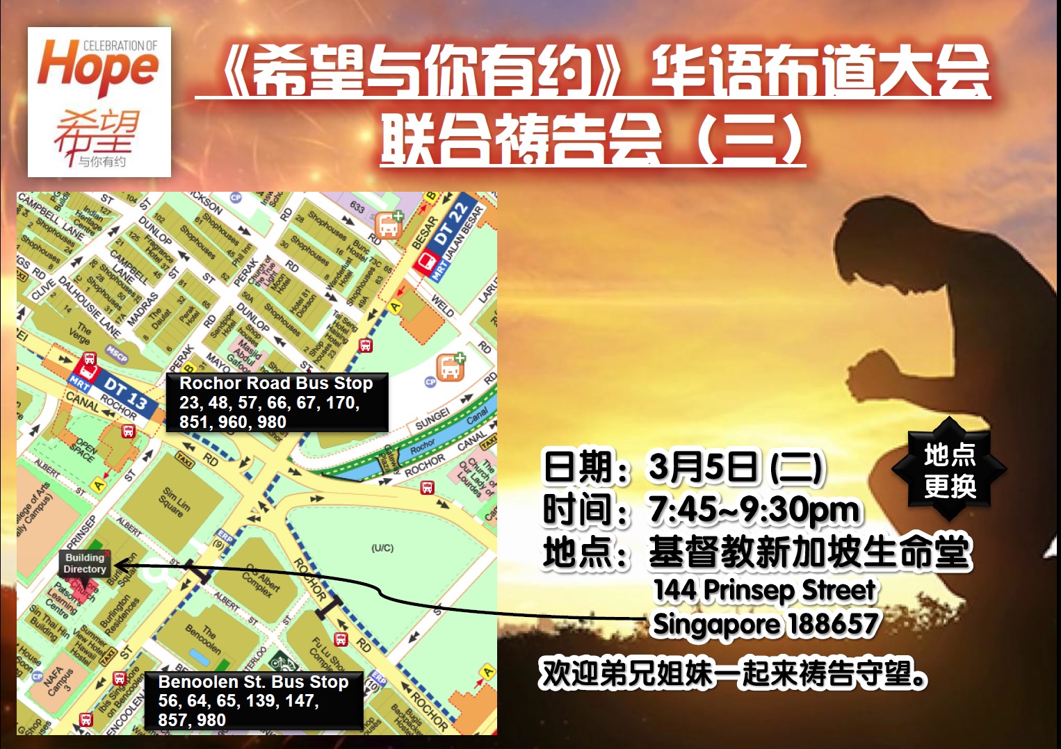 随着“希望与你有约”布道会的逼近,鼓励更多弟兄姐妹一同祷告守望。3月5日将有一场联合祷告会,欢迎大家出席参与。