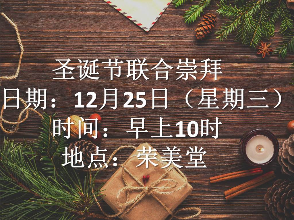 December 5, 2019 sjsmcweb 圣诞节联合崇拜(12月25日)Christmas Service (Mandarin) 日期:12月25日(星期三)Dec 25 (Wed)时间:早上10时 10am地点:荣美堂 Glory Sanctuary Share this: Share on X (Opens in new window) X Share on Facebook (Opens in new window) Facebook Like Loading...