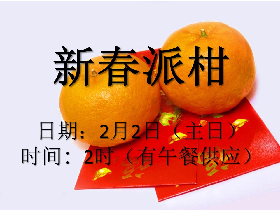 一年一度的春节即将来临。牧区为了与杜弗社区分享新年的祝福,特此派柑。 日期:2月2日(主日)时间:2时(有午餐供应)