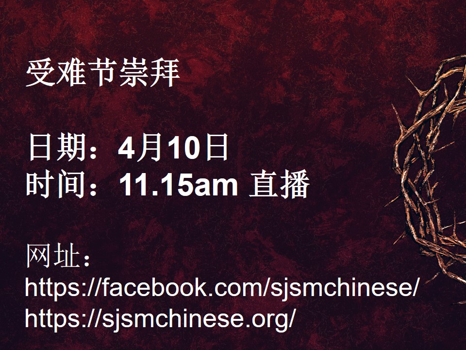 March 31, 2020March 31, 2020 sjsmcweb 受难节(4月10日,星期五) 受难节 4月10日,11时15分 直播 网址:https://facebook.com/sjsmchinese/ Share this: Share on X (Opens in new window) X Share on Facebook (Opens in new window) Facebook Like Loading...