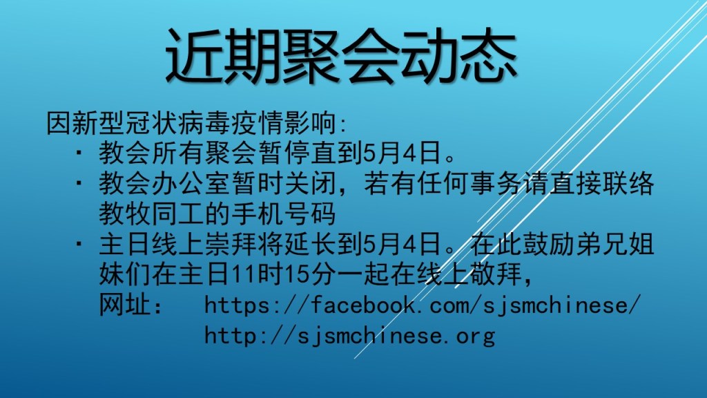 在此鼓励弟兄姐妹们在主日11时15分一起在线上敬拜,网址:https://facebook.com/sjsmchinese/