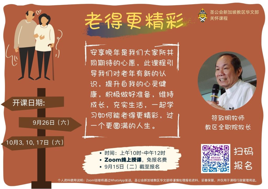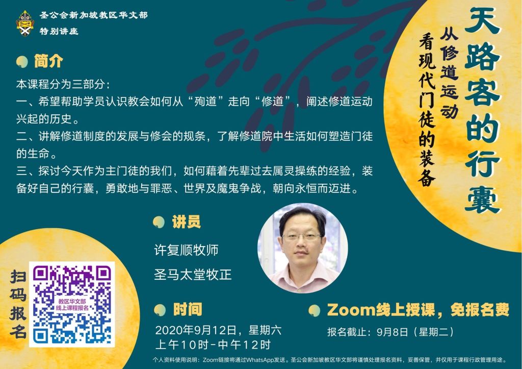 经华文部执委会决定,信徒培训课程通过Zoom线上授课的期间,将免收取报名费。报名详情:请扫描QR Code, 输入资料,(必须输入手机号码,以发送Zoom 链接)收到资料后会通知你。个人资料使用说明:Zoom链接将通过WhatsApp发送。圣公会新加坡教区华文部将谨慎处理报名资料,妥善保管,并仅用于课程行政管理用途。