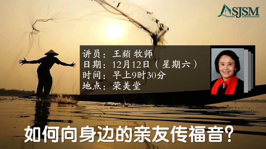 12月12日,我们将举办个人布道讲座《如何向身边的亲友传福音?》,内容是如何有效地向信奉不同民间信仰,以及无神论的亲友传福音。