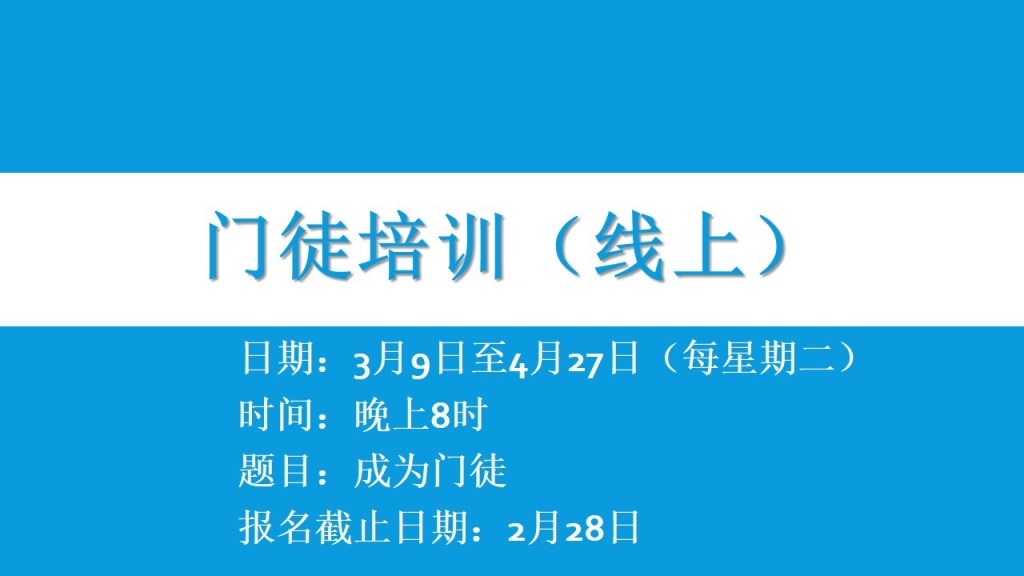 February 4, 2021February 17, 2021 sjsmcweb 门徒培训(3月9日,星期二开始) 本堂将安排8次线上门徒培训课程,日期:3月9日至4月27日(每星期二),时间:晚上8时,题目:成为门徒,报名截止日期:2月28日,请向各组组长报名,鼓励弟兄姐妹们报名参加。 Share this: Share on X (Opens in new window) X Share on Facebook (Opens in new window) Facebook Like Loading...