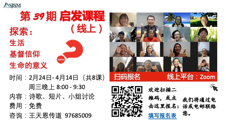 February 5, 2021February 6, 2021 sjsmcweb 启发课程(线上)(2月24日,星期三开始) 即将开始的第39期启发课程仍然采用线上形式(Zoom),共有8课,详情如下: 日期:2月24日-4月14日(周三)时间:晚上8:00-9:30(圣灵周末时间待定) 欢迎未信的朋友报名,请点击此。 下载电子报名表,请点击此。 什么是启发? https://youtu.be/5FqHHr-3OFs Share this: Share on X (Opens in new window) X Share on Facebook (Opens in new window) Facebook Like Loading...
