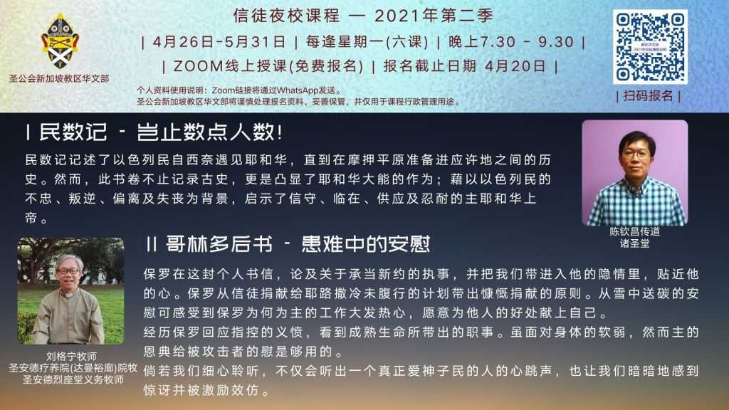 开课日期:2021年4月26日 ,时间:每逢星期一,晚上7时30分 Zoom线上授课,免报名费 ,报名截止日期:4月20日(星期二)