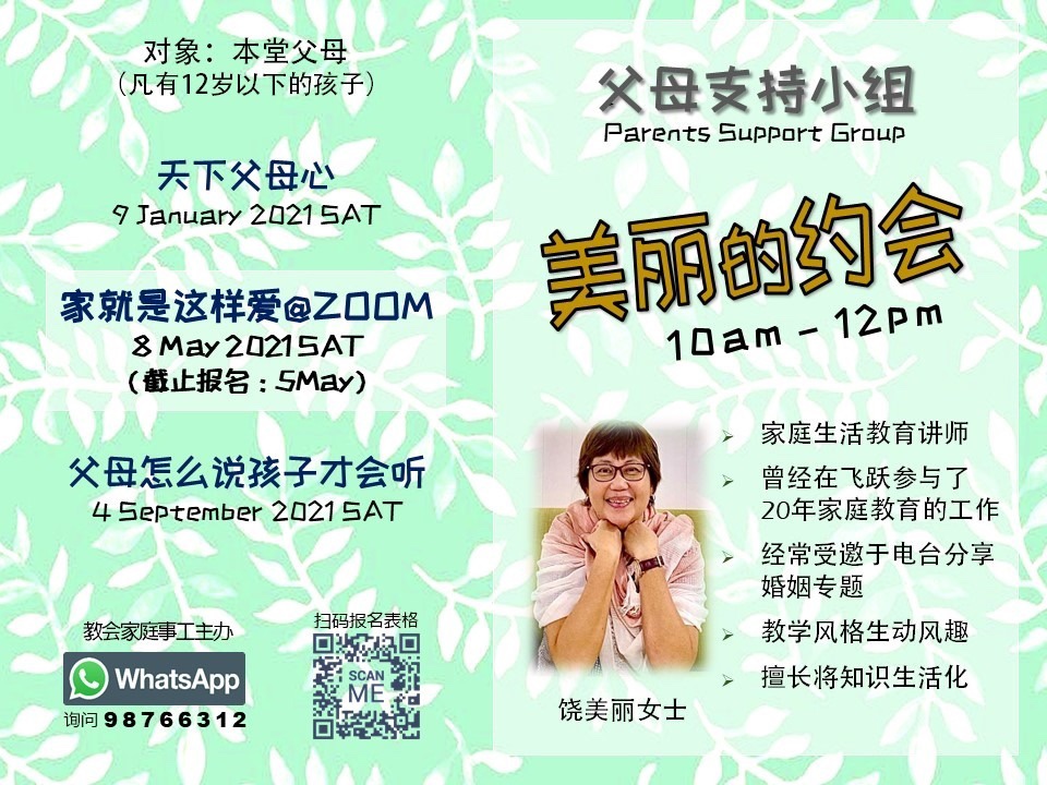 April 29, 2021 sjsmcweb 父母支持小组(5月8日,星期六) 美丽的约会第二讲将于5月8日(周六)早上10时在线上进行。美丽老师要与父母们探讨我们的家要怎样地爱使神的名得荣耀。鼓励本堂父母凡有12岁以下的孩子都来报名,可以向黄素美姐妹或卢玠瑛姐妹报名,截止日期是5月5日。 Share this: Share on X (Opens in new window) X Share on Facebook (Opens in new window) Facebook Like Loading...