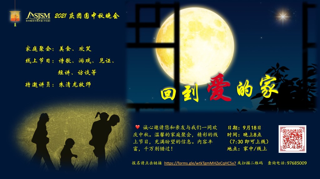 今年受疫情影响,教会将举办首次线上“庆团圆中秋晚会”,主题是“回到爱的家”,特邀讲员是朱清龙牧师(圣保罗堂)。