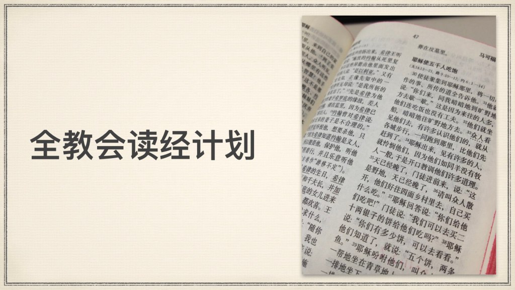 从今年1月10日开始,教会将透过小组启动“全教会读经计划”,目标是一年读完新约圣经。计划详情,包括读经进度、灵修资料、评估及奖励方式等,将由组长传达给组员。乐龄小组由志英传道统一安排。没有小组的弟兄姐妹若要参与,请于1月9日前向天恩传道报名。鼓励大家一齐来参与读经计划,通过每日读经,从圣经中发掘真理的宝藏,并透过默想与神同行。