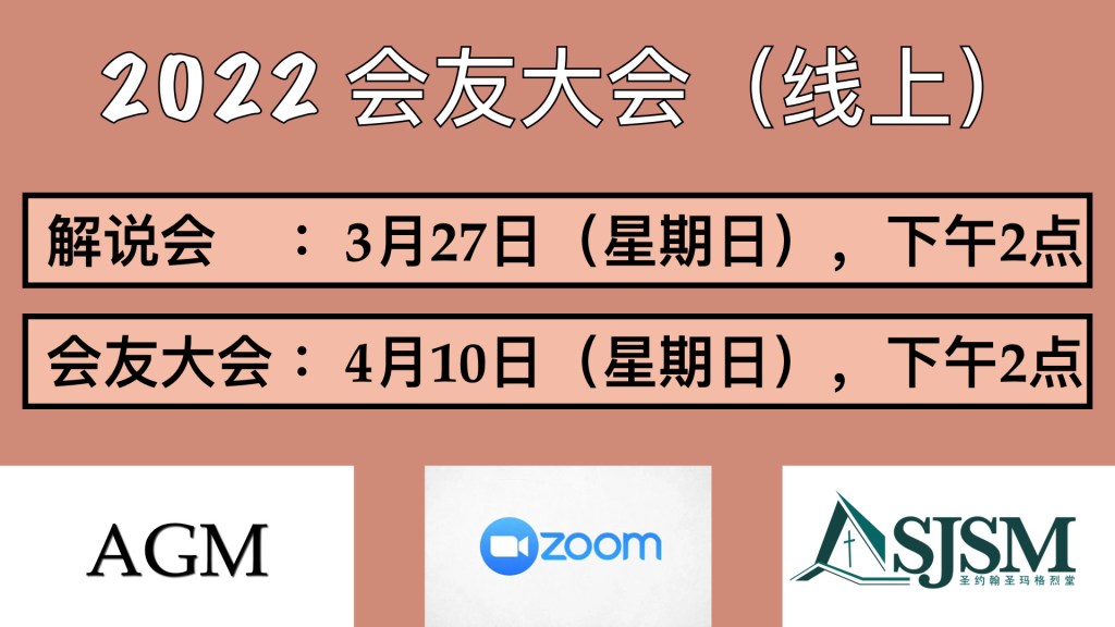 会友大会和解说会通过Zoom线上,时间是下午2时进行。解说会日期:3月27日(主日)会友大会日期:4月10日(主日)