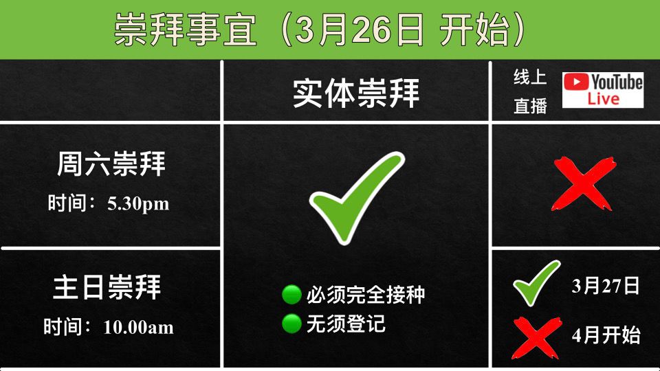 March 20, 2022April 30, 2022 sjsmcweb 实体崇拜(3月26日 更新) 实体崇拜措施更新,从3月26日(周六)开始再无须上网登记报名,但参加者必须完成接种疫苗,并要过14天。 从4月3日(主日)开始停止直播。3月27日是最后一次的直播。 Share this: Share on X (Opens in new window) X Share on Facebook (Opens in new window) Facebook Like Loading...
