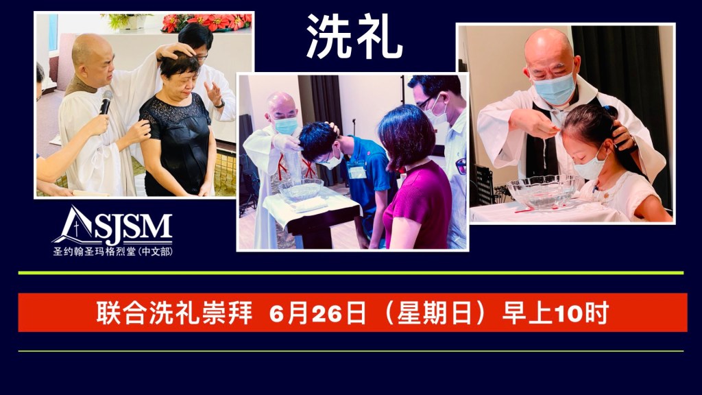 May 10, 2022June 28, 2022 sjsmcweb 联合洗礼崇拜(6月26日,星期日) 日期:6月26日(主日),时间:10时正请向办公室索取洗礼报名表格,填写后,附上一张护照相片。敬请注意:6月25日(周六)崇拜暂停 Share this: Share on X (Opens in new window) X Share on Facebook (Opens in new window) Facebook Like Loading...
