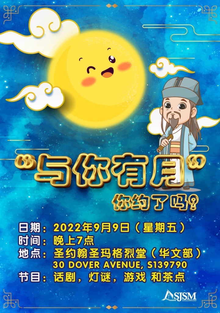 August 2, 2022September 12, 2022 sjsmcweb “与你有月” 中秋布道晚会(9月9日,周五) “与你有月”中秋布道晚会日期:9月9日(周五), 时间:晚上7时开始。门票:每张$3(门票将在8月出售)。鼓励大家邀请新朋友参加。 Share this: Share on X (Opens in new window) X Share on Facebook (Opens in new window) Facebook Like Loading...