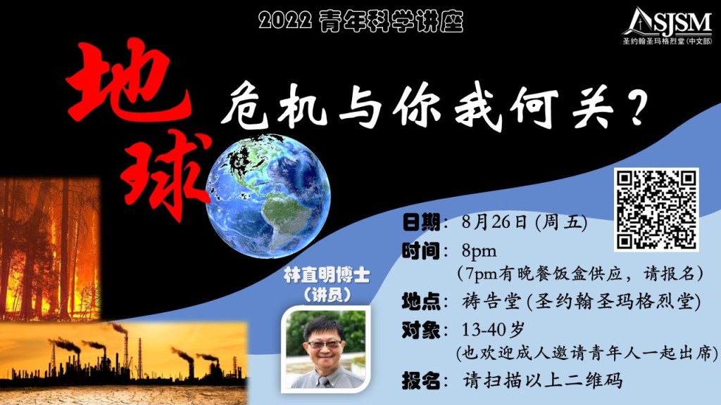 August 15, 2022August 29, 2022 sjsmcweb 2022 青年科学讲座(8月26日,星期五) 2022 青年科学讲座 主题:地球危机与你我何关? 日期:8月26日(周五) 讲员:林直明 博士 时间:8pm(7pm有晚餐饭盒供应,请报名) 对象:13-40岁(也欢迎成人邀请青年人一起出席) 地点:祷告堂 (圣约翰圣玛格烈堂) 报名链接:https://form.jotform.com/222060677742456 Share this: Share on X (Opens in new window) X Share on Facebook (Opens in new window) Facebook Like Loading...