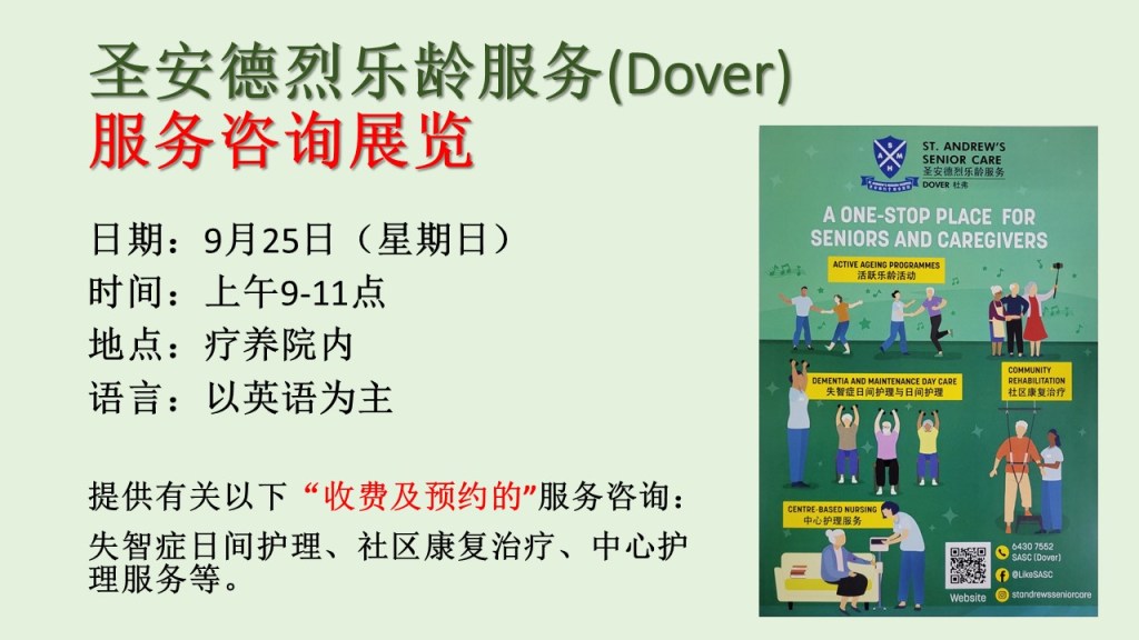 September 21, 2022September 28, 2022 sjsmcweb 圣安德烈乐龄服务(杜弗) 服务咨询详情如下:日期:9月25日(星期日)时间:早上9-11时地点:疗养院内内容:提供有关该服务的咨询,包括收费、预约及服务范畴。 Share this: Share on X (Opens in new window) X Share on Facebook (Opens in new window) Facebook Like Loading...