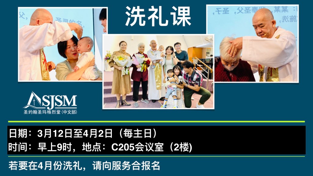 February 28, 2023March 15, 2023 sjsmcweb 洗礼课(3月12日开始) 日期:3月12日至4月2日(每主日) 时间:早上9时,地点:C205 会议室(2楼) 诺要在4月份洗礼,请向服务台报名 Share this: Share on X (Opens in new window) X Share on Facebook (Opens in new window) Facebook Like Loading...