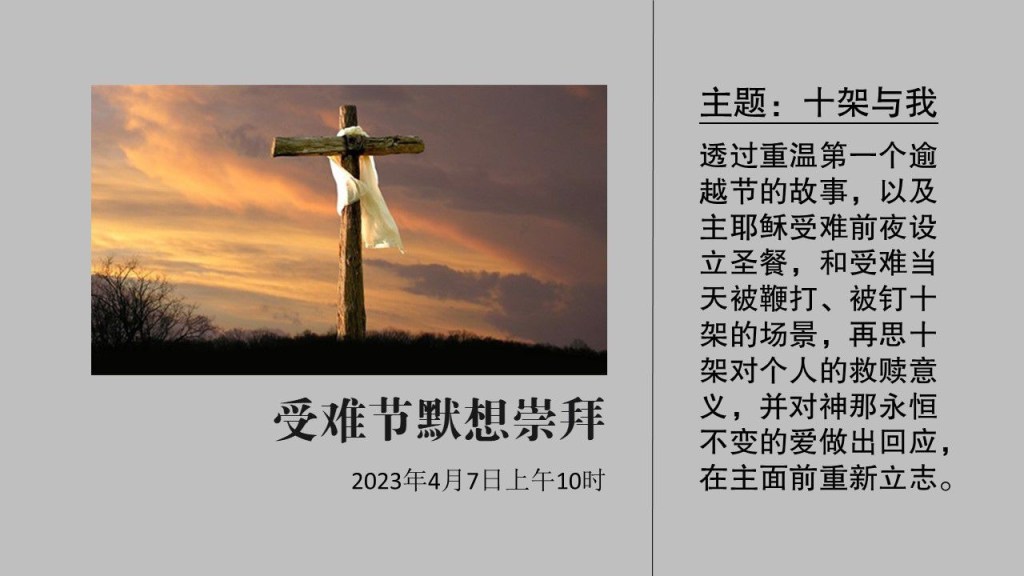 April 4, 2023 sjsmcweb 受难节 崇拜 日期:4月7日(周五) 时间:早上10点 地点:荣美堂 Share this: Share on X (Opens in new window) X Share on Facebook (Opens in new window) Facebook Like Loading...
