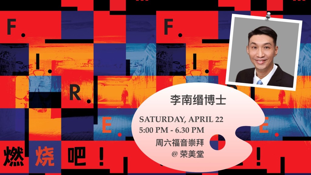 April 17, 2023April 18, 2023 sjsmcweb 福音主日(4月22日,周六) 日期:4月22日(周六)主题:F.I.R.E.燃烧吧!讲员:李南缗博士 Share this: Share on X (Opens in new window) X Share on Facebook (Opens in new window) Facebook Like Loading...