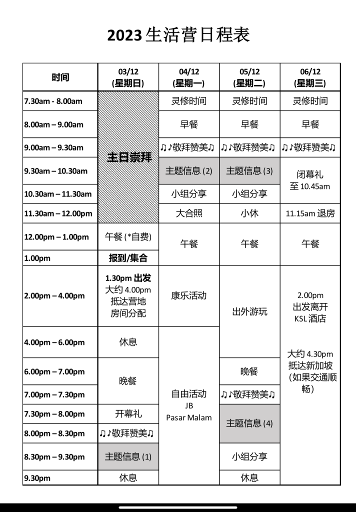 July 11, 2023July 11, 2023 sjsmcweb 教会生活营(12月3-6日) 主题: 重整待发 日期: 12月3-6日(周日至周三) 地点: 马来西亚柔佛新山KSL酒店 讲员: 陈祯荣牧师 欢迎弟兄姐妹们踊跃报名参加! 报名表格请到服务台索取。 Share this: Share on X (Opens in new window) X Share on Facebook (Opens in new window) Facebook Like Loading...