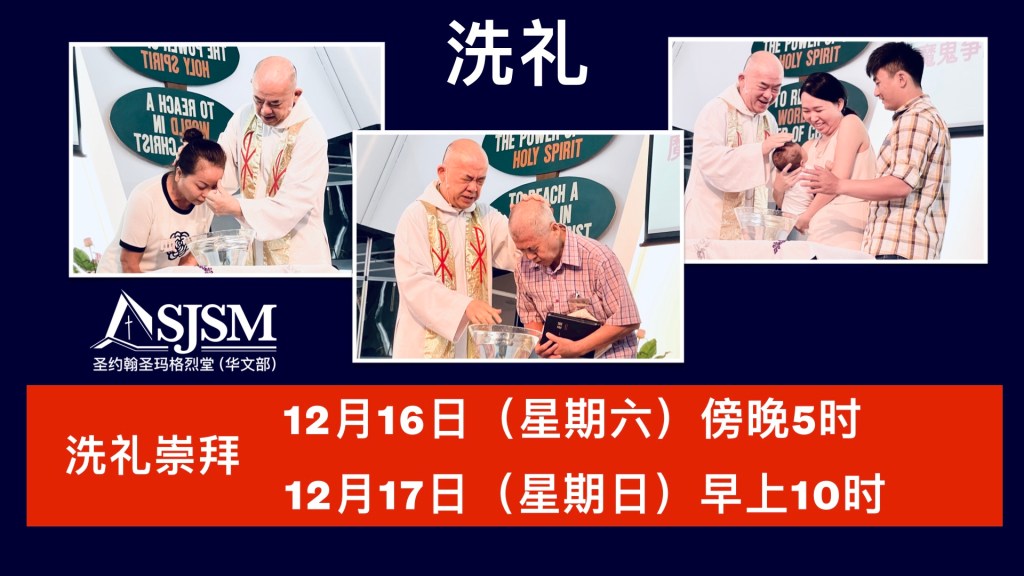 October 31, 2023October 31, 2023 sjsmcweb 2023 洗礼(12月16日,17日) 日期:12月16日(周六 )及17日 (周日)洗礼报名表格:请向服务台索取。填写后、并附上一张护照型照片、最迟于11月12日之前交回办公室.。敬请注意:洗礼课程将在11月18日与19日开课 (周六与主日)。 Share this: Share on X (Opens in new window) X Share on Facebook (Opens in new window) Facebook Like Loading...