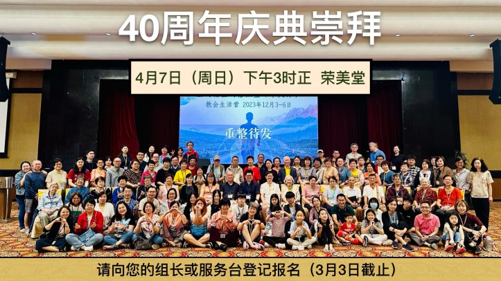 February 6, 2024February 6, 2024 sjsmcweb 40周年庆典崇拜(4月7日,周日) 本堂定于4月7日(主日)下午3时正在荣美堂进行40周年庆典崇拜。凡有意出席的本堂会友,请向你们的组长或服务台登记报名。报名截止日期:3月3日(主日) Share this: Share on X (Opens in new window) X Share on Facebook (Opens in new window) Facebook Like Loading...