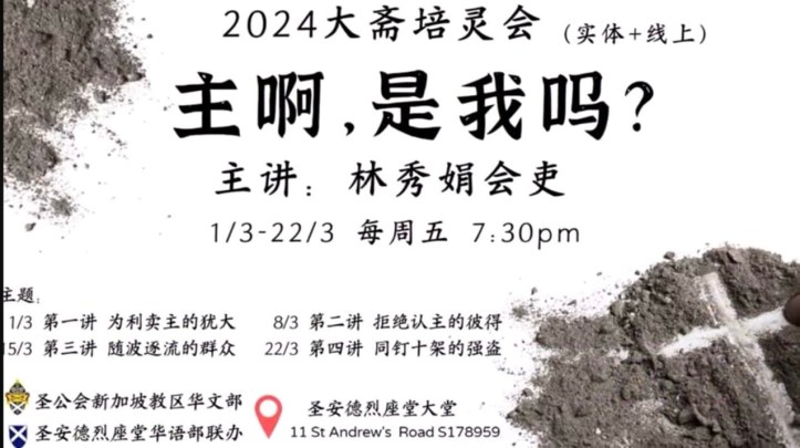 February 20, 2024 sjsmcweb 2024大斋培灵会(实体+线上) (3月1日至22日,每周五) 主题:主啊,是我吗?主讲:林秀娟会吏日期 : 3月1日至22日(每周五)时间 : 晚上7时30分地点 : 圣安德烈座堂(11 St Andrew’s Road, S178959)鼓励弟兄姐妹参加。 Share this: Share on X (Opens in new window) X Share on Facebook (Opens in new window) Facebook Like Loading...