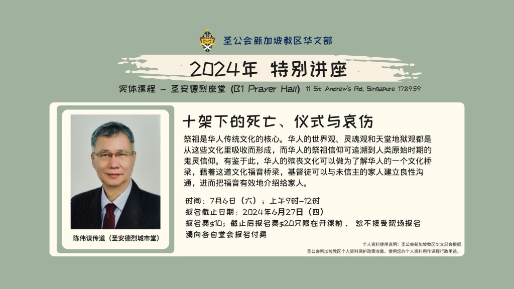 May 21, 2024 sjsmcweb 教区特别讲座(7月6日,周六) 讲题:十架下的死亡、仪式与哀伤,讲员:陈伟谋传道日期:7月6日(周六)上午9时至12时,地点:圣安德烈座堂报名截止日期:6月27日(周四)报名费$10, 截止后报名费$20只限于开课前;恕不接受现场报名 Share this: Share on X (Opens in new window) X Share on Facebook (Opens in new window) Facebook Like Loading...