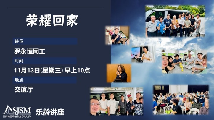 October 24, 2024December 1, 2024 sjsmcweb 乐龄讲座 – 荣耀回家(11月13日,周三) 乐龄讲座主题:荣耀回家,内容:讲解基督教各种殡葬仪式讲员:罗永恒同工日期:11月13日(星期三)时间:早上10点(乐龄团契时段)参加者,请向服务台报名,以便安排午餐供应 Share this: Share on X (Opens in new window) X Share on Facebook (Opens in new window) Facebook Like Loading...