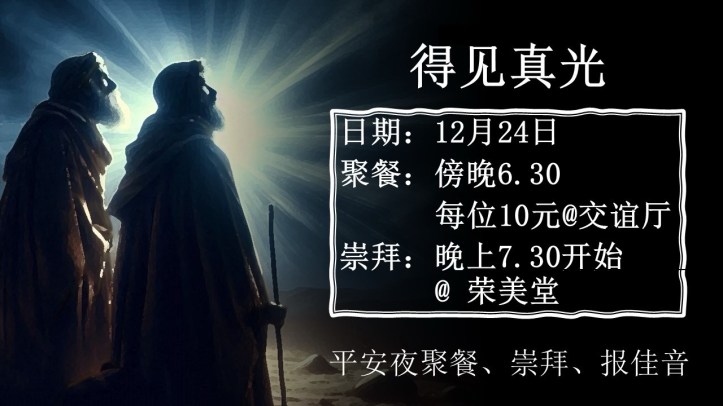 November 12, 2024January 5, 2025 sjsmcweb 平安夜崇拜及聚餐(12月24日,周二) 日期:12月24日(星期二)崇拜时间:晚上7时半开始地点:荣美堂崇拜前有聚餐,欢迎大家自由参与: 时间:傍晚6时半开始地点:交谊厅费用:每位10元请到服务台报名, 截止日期是12月8日(主日) Share this: Share on X (Opens in new window) X Share on Facebook (Opens in new window) Facebook Like Loading...