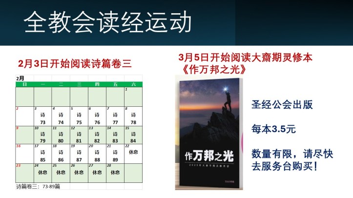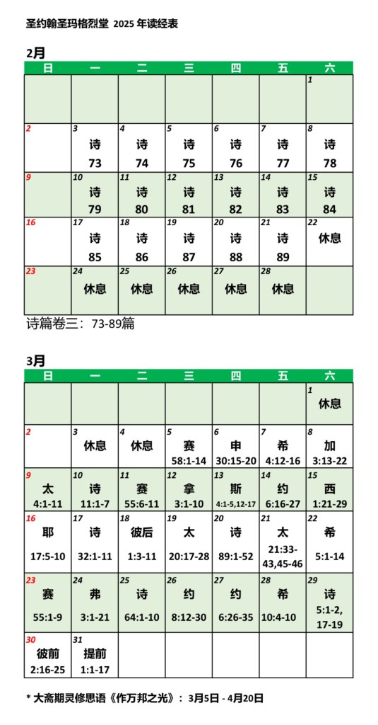 January 26, 2025February 18, 2025 sjsmcweb 全教会读经运动(2025年 2月-3月) 从2月3日(周一)开始:将阅读《诗篇》卷三(73-89篇)3月5日(周三)起:将阅读大斋期灵修思语《作万邦之光》,每本3.5元,请到服务台购买。 Share this: Share on X (Opens in new window) X Share on Facebook (Opens in new window) Facebook Like Loading...