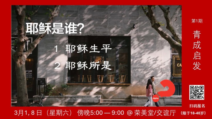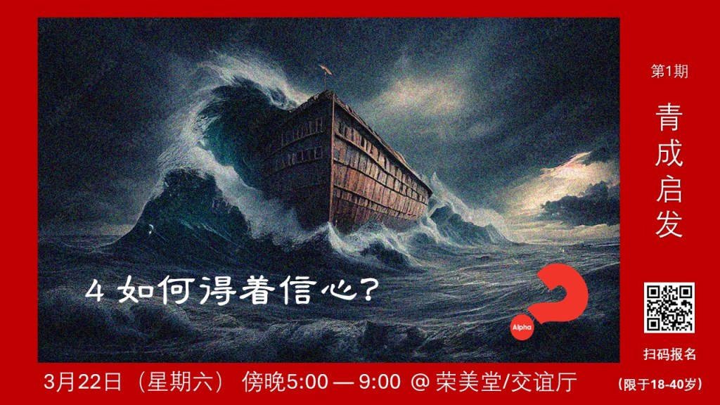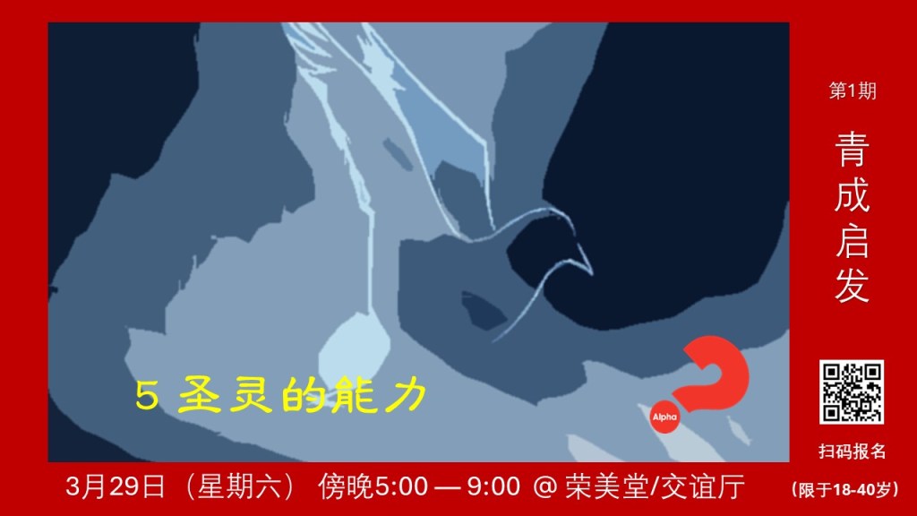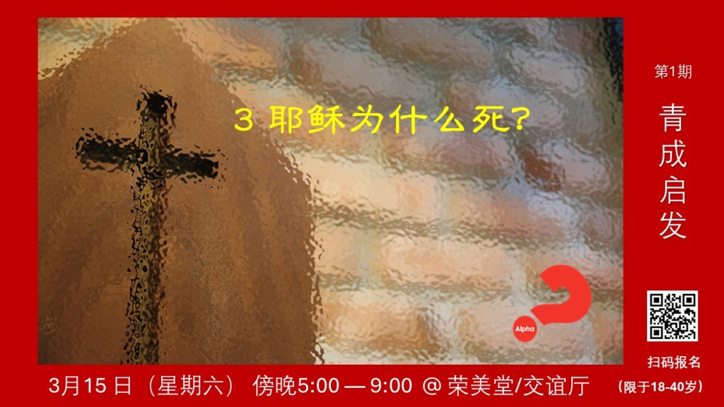 今年 3 月将举办第 1 期青成启发, 结合周六崇拜及后续时间(傍晚 5点—9 点,共 5 讲),崇拜讲台息围绕启发的四个重要主题,之后接续晚餐、视频(或见证)及讨论。