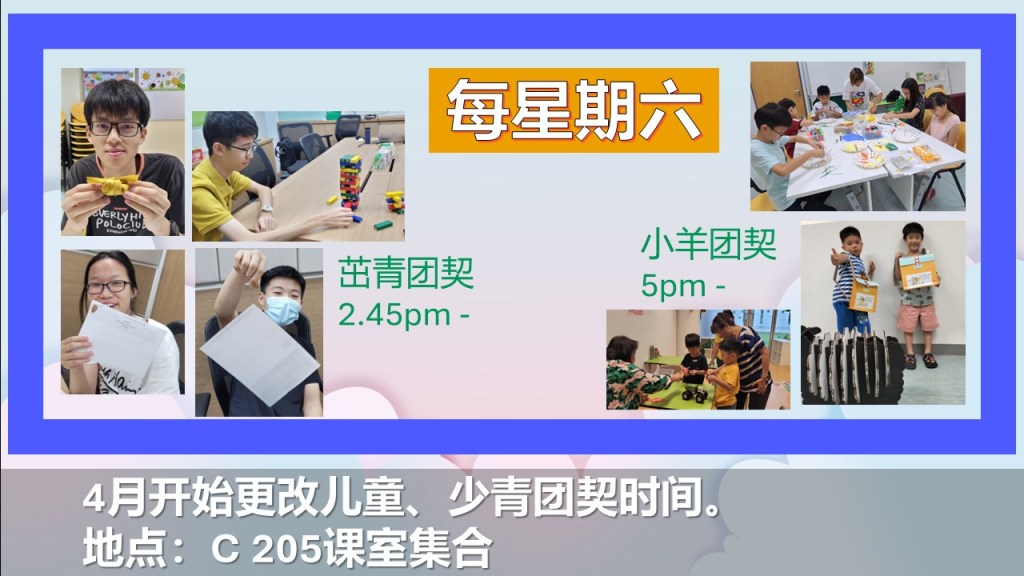 April 8, 2025 sjsmcweb 儿童及少青团契时间和地点更改 由四月开始,儿童及少青团契将在周六举行。时间:茁青团契:下午2时45分开始小羊团契:下午5时开始地点:C205 课室集合 Share this: Share on X (Opens in new window) X Share on Facebook (Opens in new window) Facebook Like Loading...