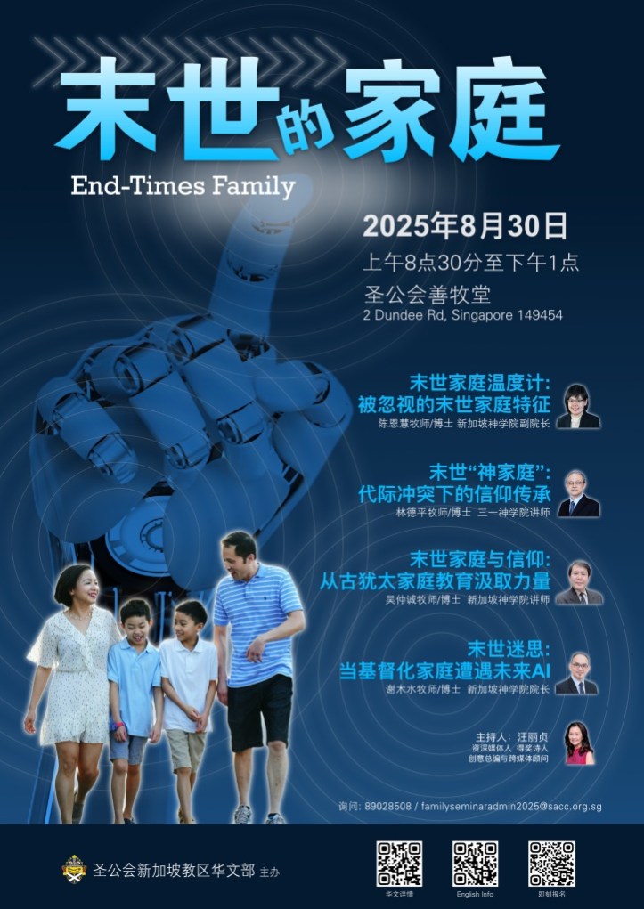 July 15, 2025July 15, 2025 sjsmcweb 《末世的家庭》(8月30日,周六) 教区家庭研讨会 主题: 末世的家庭》日期: 8月30日(六)时间: 上午8时30分 至 下午1时地点: 善牧堂报名费:成人$20,儿童(6-12岁) $5报名截止日期:7月31日(四)请到服务台报名。恕不接受现场报名。 Share this: Share on X (Opens in new window) X Share on Facebook (Opens in new window) Facebook Like Loading...