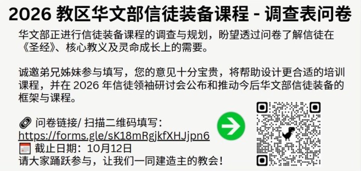September 9, 2025 sjsmcweb 信徒装备课程问卷 教区华文部正在规划新的信徒装备课程,诚邀您参与填写培训课程问卷。您的意见能帮助我们设计更实用、对灵命成长和事奉更有帮助的培训。不论您信主多久,处在哪个阶段,您的建议都非常宝贵。请扫描二维码填写问卷。 Share this: Share on X (Opens in new window) X Share on Facebook (Opens in new window) Facebook Like Loading...
