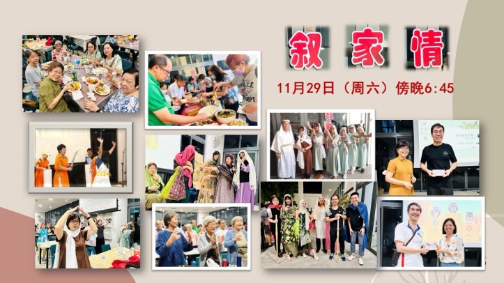 今年最后一次的小组聚会!晚餐将沿袭传统的 potluck 形式,由各组一起来预备和分享美味佳肴,每组鼓励奉献 2 道菜肴,每道菜约 25 人份。节目将在区组长群通知,当中穿插圣经知识比赛,重温今年的读经内容。