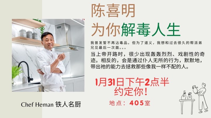 December 30, 2025 sjsmcweb 少年、青成讲座(1月31日,周六) 讲题:【解毒人生】讲员: 陈喜明弟兄(铁人名厨)日期:1 月 31 日(星期六)时间:下午 2 点半地点:4 楼 B405 会议室报名:服务台欢迎少年的家长、青成;并邀请新朋友出席。 Share this: Share on X (Opens in new window) X Share on Facebook (Opens in new window) Facebook Like Loading...