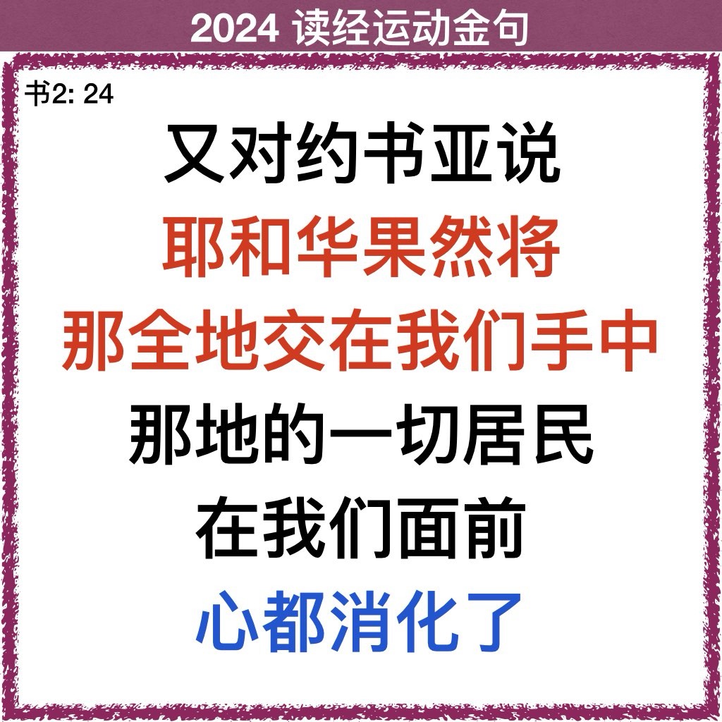 22 二人到山上,在那里住了三天,等着追赶的人回去了。追赶的人一路找他们,却找不着。 23 二人就下山回来,过了河,到嫩的儿子约书亚那里,向他述说所遭遇的一切事。 24 又对约书亚说:“耶和华果然将那全地交在我们手中,那地的一切居民在我们面前心都消化了。”