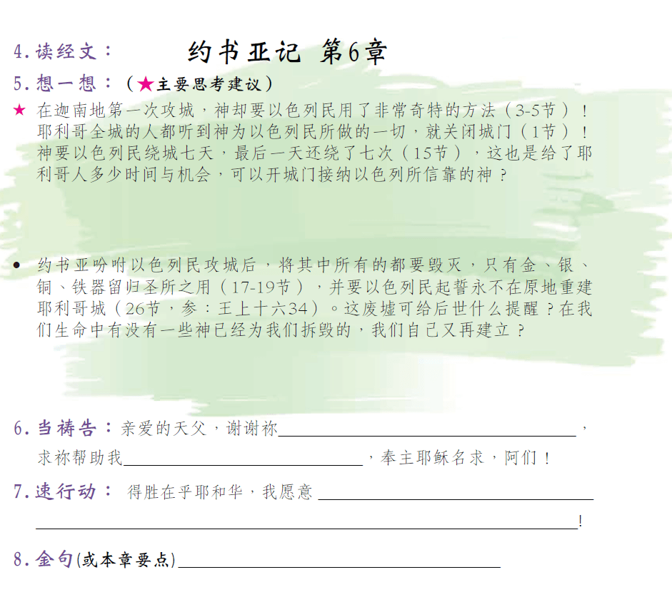 8 约书亚对百姓说完了话,七个祭司拿七个羊角走在耶和华面前吹角,耶和华的约柜在他们后面跟随。 9 带兵器的走在吹角的祭司前面,后队随着约柜行。祭司一面走一面吹。 10 约书亚吩咐百姓说:“你们不可呼喊,不可出声,连一句话也不可出你们的口,等到我吩咐你们呼喊的日子,那时才可以呼喊。” 11 这样,他使耶和华的约柜绕城,把城绕了一次。众人回到营里,就在营里住宿。