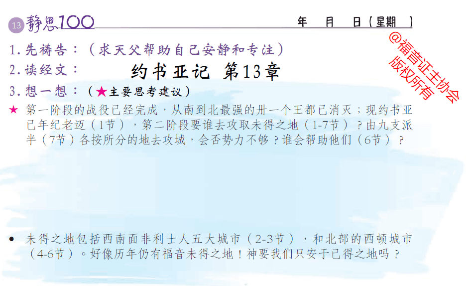 1 约书亚年纪老迈,耶和华对他说:“你年纪老迈了,还有许多未得之地, 2 就是非利士人的全境和基述人的全地: 3 从埃及前的西曷河往北,直到以革伦的境界,就算属迦南人之地,有非利士人五个首领所管的加沙人、亚实突人、亚实基伦人、迦特人、以革伦人之地,并有南方亚卫人之地。 4 又有迦南人的全地,并属西顿人的米亚拉到亚弗,直到亚摩利人的境界。 5 还有迦巴勒人之地,并向日出的全黎巴嫩,就是从黑门山根的巴力迦得,直到哈马口。 6 山地的一切居民,从黎巴嫩直到米斯利弗玛音,就是所有的西顿人,我必在以色列人面前赶出他们去。你只管照我所吩咐的,将这地拈阄分给以色列人为业。 7 现在你要把这地分给九个支派和玛拿西半个支派为业。”