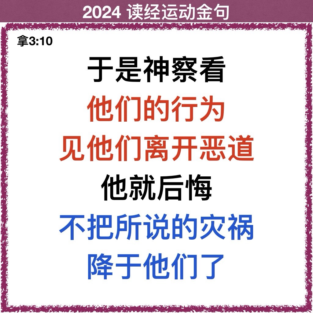 10 于是神察看他们的行为,见他们离开恶道,他就后悔,不把所说的灾祸降于他们了。