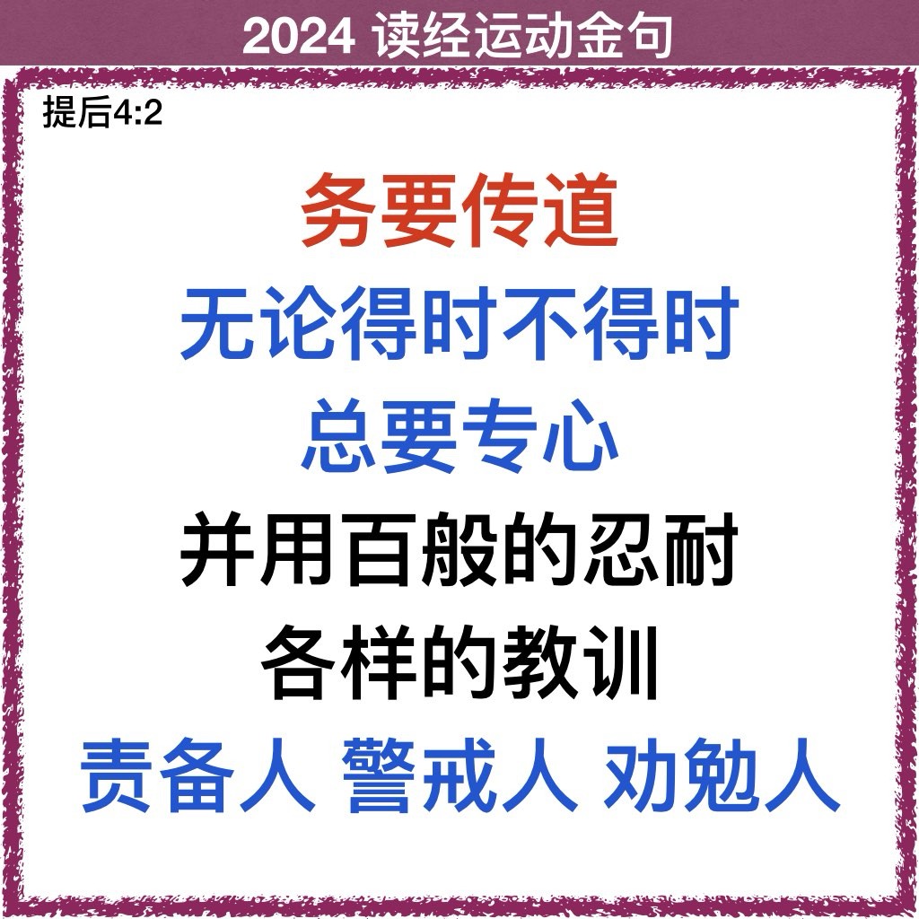 1 我在神面前,并在将来审判活人死人的基督耶稣面前,凭着他的显现和他的国度嘱咐你: 2 务要传道,无论得时不得时总要专心;并用百般的忍耐、各样的教训责备人、警戒人、劝勉人。 3 因为时候要到,人必厌烦纯正的道理,耳朵发痒,就随从自己的情欲,增添好些师傅, 4 并且掩耳不听真道,偏向荒渺的言语。 5 你却要凡事谨慎,忍受苦难,做传道的工夫,尽你的职分。 6 我现在被浇奠,我离世的时候到了。